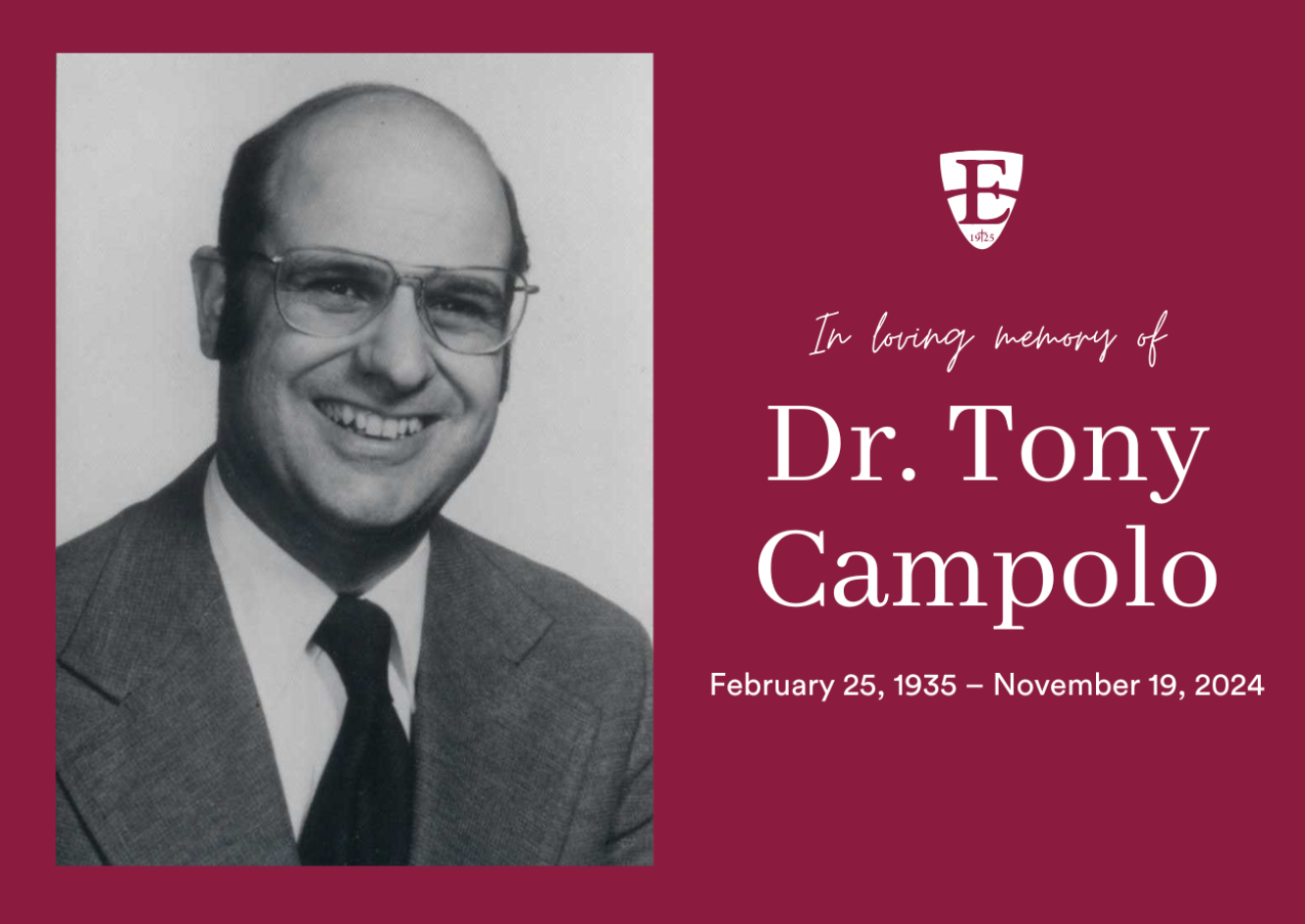 It is with both heavy hearts and deep appreciation that Eastern University honors the passing of Rev. Dr. Tony Campolo, one of Eastern's most influential alumni and a beloved member of our community. Tony, a devout follower of Jesus who dedicated his life to serving others and spreading the message of love, compassion, and justice, passed away peacefully on November 19, 2024, at the age of 89, surrounded by his family in Bryn Mawr, Pennsylvania.