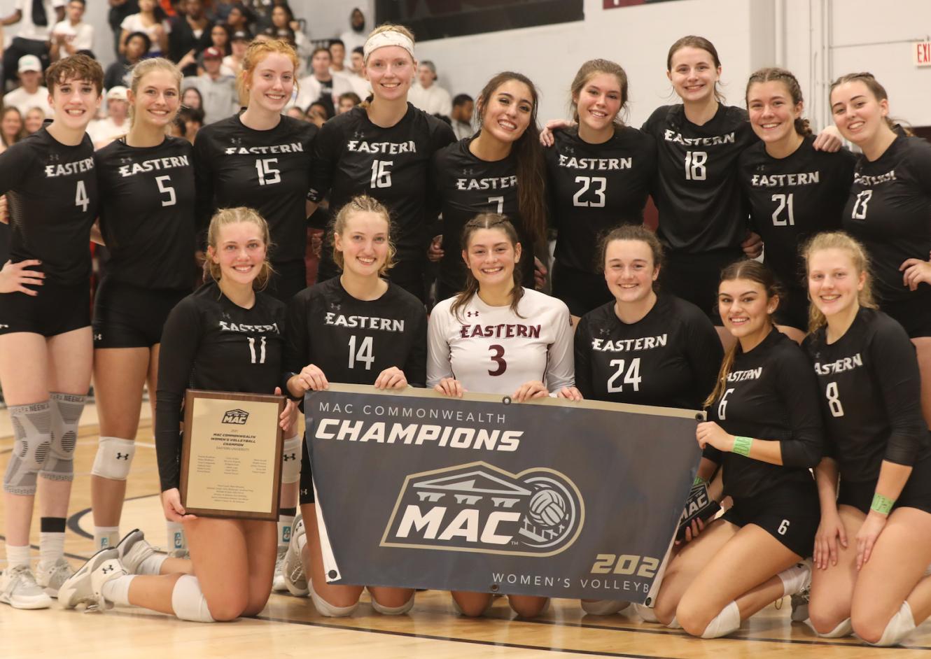 ST. DAVIDS, PA – It did not look like it was going to happen. For the first forty-five minutes of the 2022 MAC Commonwealth Women's Volleyball Championship, the top-seeded Eastern University Eagles could do nothing against an efficient Stevenson University attack. The Mustangs raced to a pair of lopsided set wins and put the Eagles' backs against the wall. After scoring just 26 points in the opening two sets, the Eagles reeled off three-consecutive wins to earn a second-straight MAC Commonwealth title and the league's bid to the NCAA Tournament.